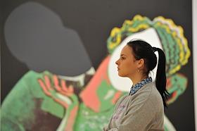 Посетительница на пресс-показе выставки американского художника-концептуалиста Джона Балдессари "1+1=1" в Центре современной культуры (ЦСК) "Гараж".