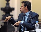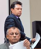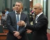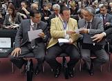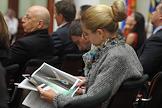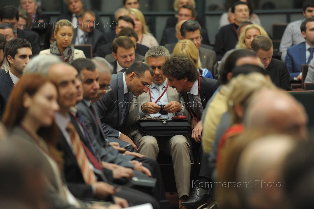 Международный ювелирный экономический форум. Директор административного Департамента министерства финансов России Александр Ахполов (внизу) и заместитель председателя комитета Государственной думы России по экономической политике, инновационному развитию и предпринимательству Виктор Звагельский (вверху) в Конгресс-центре Торгово-промышленной палаты России.