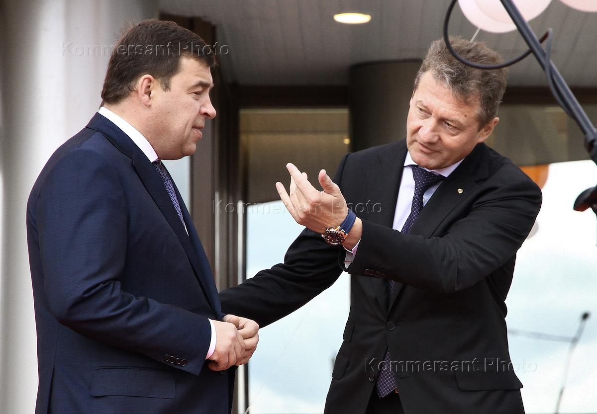 Губернатор Свердловской области Евгений Куйвашев (слева) и генеральный директор УГМК-Холдинга Андрей Козицын (справа) на церемонии открытия Технического университета Уральской горно-металлургической компании (УГМК).