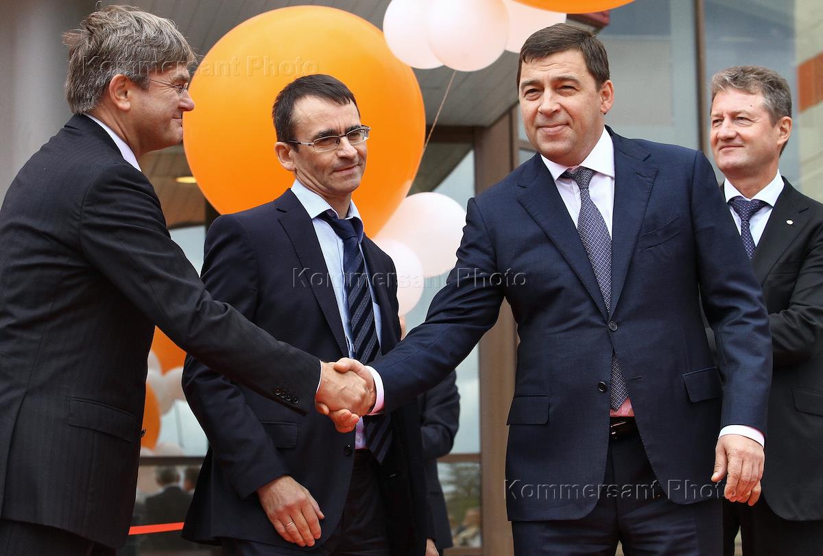 Заместитель министра образования и науки России Александр Климов (второй слева), губернатор Свердловской области Евгений Куйвашев (второй справа) и генеральный директор УГМК-Холдинга Андрей Козицын (справа) на церемонии открытия Технического университета Уральской горно-металлургической компании (УГМК).