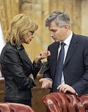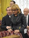 Министр правительства Москвы, руководитель Департамента финансов города Москвы Вера Чистова (слева) и министр правительства Москвы, руководитель Департамента культурного наследия города Москвы Александр Кибовский (справа) перед началом заседания правительства Москвы.