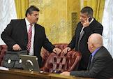 Депутат Московской городской думы Александр Семенников (слева), министр правительства Москвы, руководитель Департамента образования города Москвы Исаак Калина (второй слева) и министр правительства Москвы, руководитель Департамента внешнеэкономических и международных связей города Москвы Сергей Черемин (справа) перед началом заседания правительства Москвы.