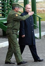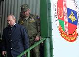 Рабочая поездка президента России Владимира Путина в Калиниград. Президент России Владимир Путин (слева) и министр обороны России Сергей Шойгу (справа) во время завершающего этапа российско-белорусских стратегических учений "Запад-2013". Учения прошли на полигоне Хмелевка в Калининградской области.