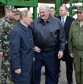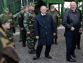 Президент России Владимир Путин (в центре) и президент Белоруссии Александр Лукашенко (справа) во время завершающего этапа российско-белорусских стратегических учений "Запад-2013". Учения прошли на полигоне Хмелевка в Калининградской области.
