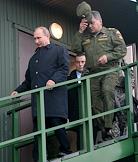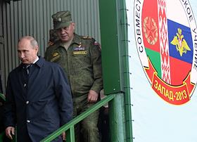 Рабочая поездка президента России Владимира Путина в Калиниград. Президент России Владимир Путин (слева) и министр обороны России Сергей Шойгу (справа) во время завершающего этапа российско-белорусских стратегических учений "Запад-2013". Учения прошли на полигоне Хмелевка в Калининградской области.