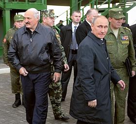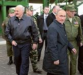Президент России Владимир Путин (в центре) и президент Белоруссии Александр Лукашенко (справа) во время завершающего этапа российско-белорусских стратегических учений "Запад-2013". Учения прошли на полигоне Хмелевка в Калининградской области.