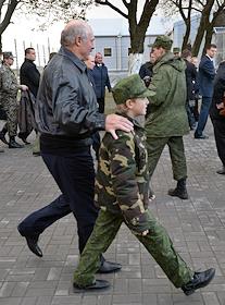Президент Белоруссии Александр Лукашенко (справа) с сыном Николаем (слева) во время завершающего этапа российско-белорусских стратегических учений "Запад-2013". Учения прошли на полигоне Хмелевка в Калининградской области.
