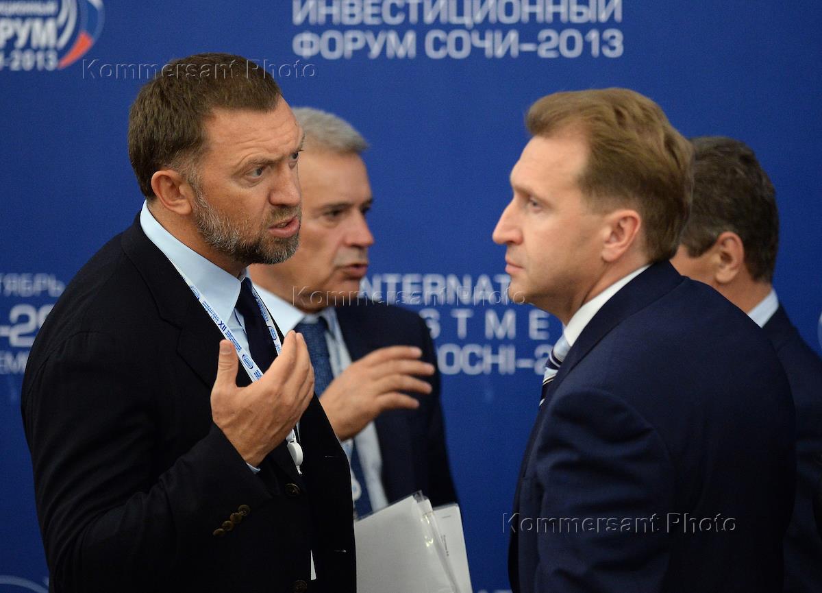 XII Международный инвестиционный форум "Сочи-2013". Президент, генеральный директор компании En + Group Олег Дерипаска(слева) и первый заместитель председателя правительства России Игорь Шувалов (справа) во время работы форума.