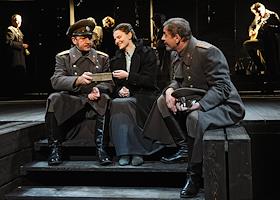 Театральный фестиваль "Золотая Маска". Пресс-показ спектакля "Три сестры" по пьесе А.П.Чехова в постановке режиссера Льва Додина (Малый драматический театр) на сцене Московского академического театра имени В.В.Маяковского. Слева направо: актеры Игорь Черневич, Елизавета Боярская и Сергей Курышев.