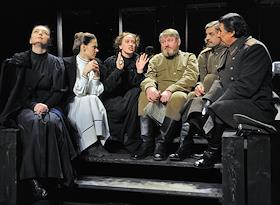 Театральный фестиваль "Золотая Маска". Пресс-показ спектакля "Три сестры" по пьесе А.П.Чехова в постановке режиссера Льва Додина (Малый драматический театр) на сцене Московского академического театра имени В.В.Маяковского. Актеры Игорь Черневич (слева) и Сергей Курышев (справа).