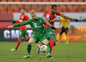 СОГАЗ-Чемпионат России по футболу 2013/2014. 11-й тур. Игрок команды "Томь" Павел Игнатович (в центре) в матче между командами "Локомотив"(Москва) и "Томь" (Томск) на стадионе "Локомотив".