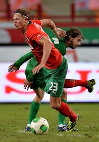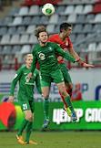 СОГАЗ-Чемпионат России по футболу 2013/2014. 11-й тур. Игрок команды "Томь" Павел Игнатович (в центре) и игрок "Локомотива" Виталий Денисов (справа) в матче между командами "Локомотив"(Москва) и "Томь" (Томск) на стадионе "Локомотив".