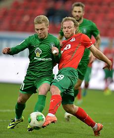 СОГАЗ-Чемпионат России по футболу 2013/2014. 11-й тур. Игрок команды "Томь" Павел Игнатович (слева) и игрок "Локомотива" Виталий Денисов (справа) в матче между командами "Локомотив"(Москва) и "Томь" (Томск) на стадионе "Локомотив".