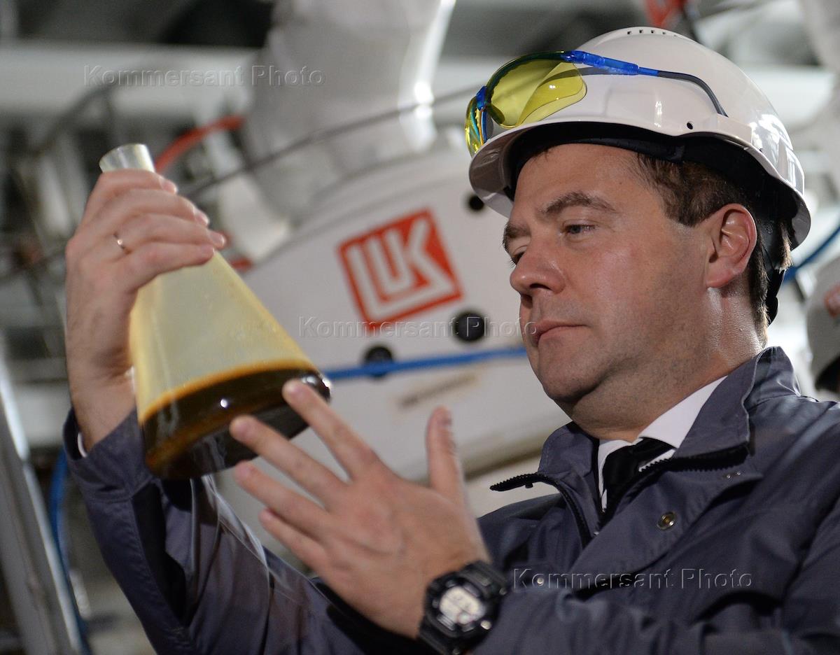 Рабочий визит председателя правительства России Дмитрия Медведева в Астраханскую область. Председатель правительства Дмитрий Медведев (в центре) и президент, председатель правления ОАО "Лукойл" Вагит Алекперов (справа) во время осмотра морской ледостойкой стационарной платформы имени Ю. Корчагина ОАО "Лукойл" в Каспийской море.