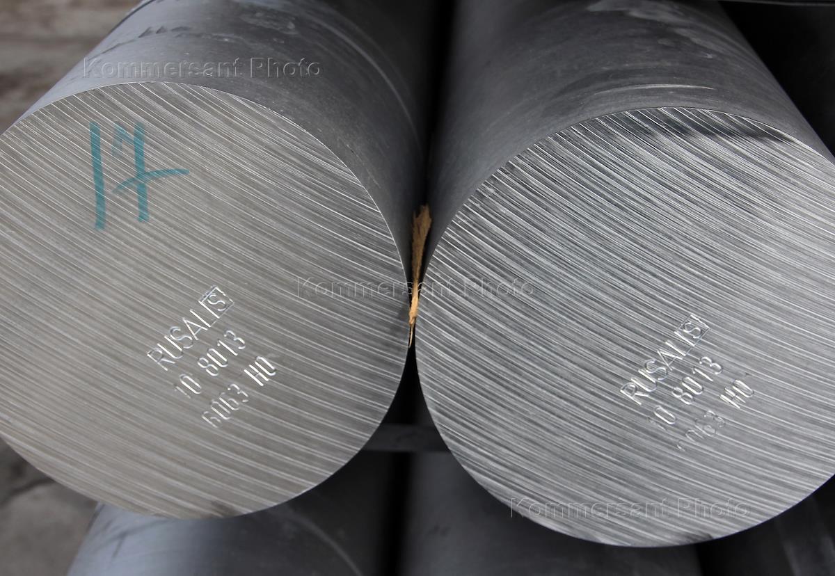 Виды большого порта "Санкт-Петербург". Слитки на алюминия на причале, подготовленные к погрузке для экспортной поставки. Бирка с надписью "Made in Russia" (Сделано в России).