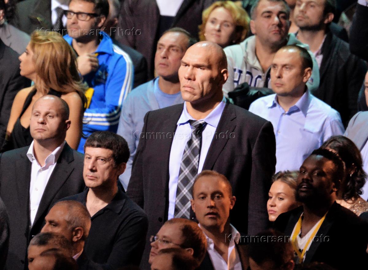 Боксерское шоу "Кличко VS Поветкин". Член комитета Государственной думы России по физической культуре, спорту и делам молодежи Николай Валуев (в центре) во время шоу в СК "Олимпийский".