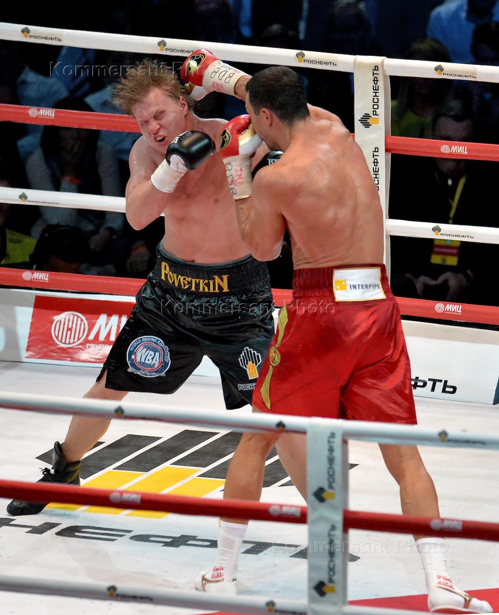 Боксерское шоу "Кличко VS Поветкин". Чемпион WBA Александр Поветкин во время боя с боксером, чемпионом мира в супертяжелом весе по версиям IBF и WBO Владимиром Кличко в СК "Олимпийский".