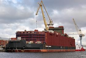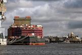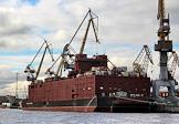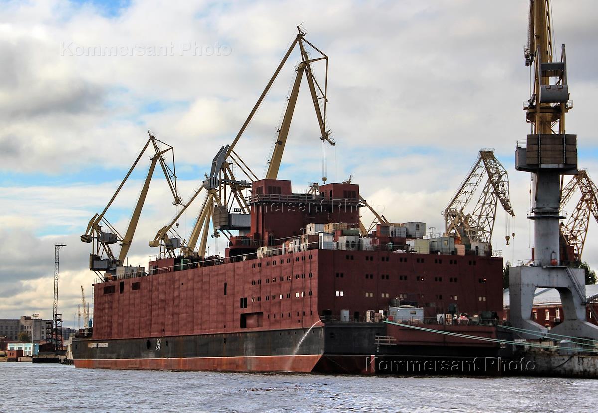 Плавучая атомная теплоэлектростанция (ПАТЭС) "Академик Ломоносов" - головной проект серии мобильных транспортабельных энергоблоков малой мощности - у достроечной стенки Балтийского судостроительнного завода.