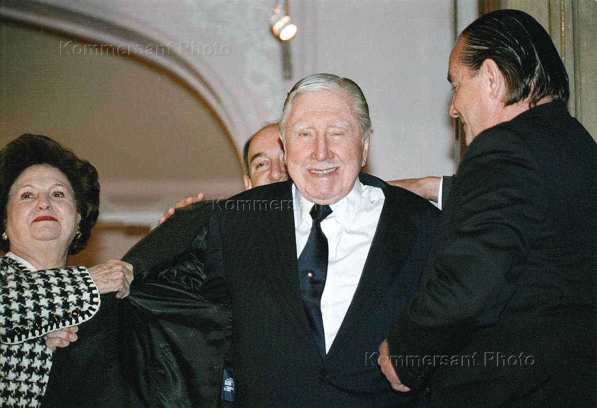 Пожизненный сенатор Чили, бывший диктатор Аугусто Пиночет (в центре) при помощи жены Лусии (слева) и помощника одевает пальто после посещения спектакля в театре Сантьяго.