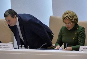 Заседание Совета Федерации (СФ) России. Заместитель председателя СФ России Евгений Бушмин (слева) и председатель СФ России Валентина Матвиенко (справа) во время заседания.