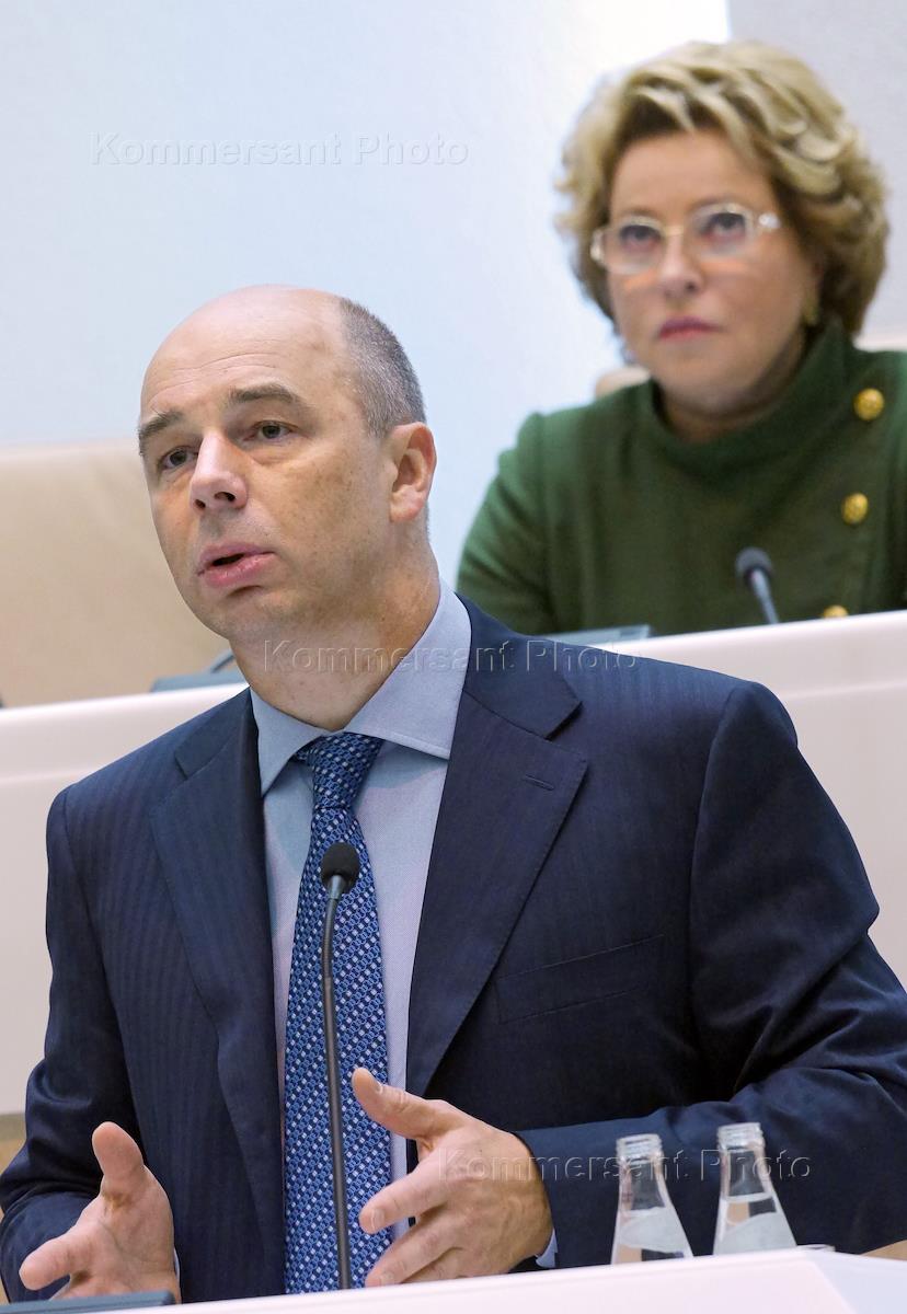 Председатель Совета Федерации России Валентина Матвиенко (слева) и министр финансов Антон Силуанов (справа) на заседании Совета Федерации России.
