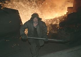 Рабочий в плавильном цеху Западно-Сибирского металлургического комбината.
