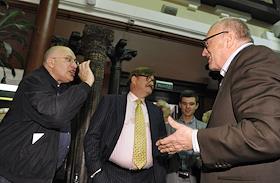 Слева направо: полномочный представитель правительства России в высших судебных инстанциях Михаил Барщевский, главный редактор радиостанции "Эхо Москвы" Алексей Венедиктов и почетный президент компании "Вымпелком" , учредитель благотворительного фонда "Династия" Дмитрий Зимин на вечере "Митинг в виде фуршета" по поводу Дня рождения "Эха Москвы". Вечер прошел в ресторане "Галерея Художника".