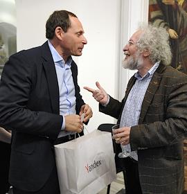 Генеральный директор компании "Яндекс" Аркадий Волож (слева) и главный редактор радиостанции "Эхо Москвы" Алексей Венедиктов (справа) на вечере "Митинг в виде фуршета" по поводу Дня рождения "Эха Москвы". Вечер прошел в ресторане "Галерея Художника".