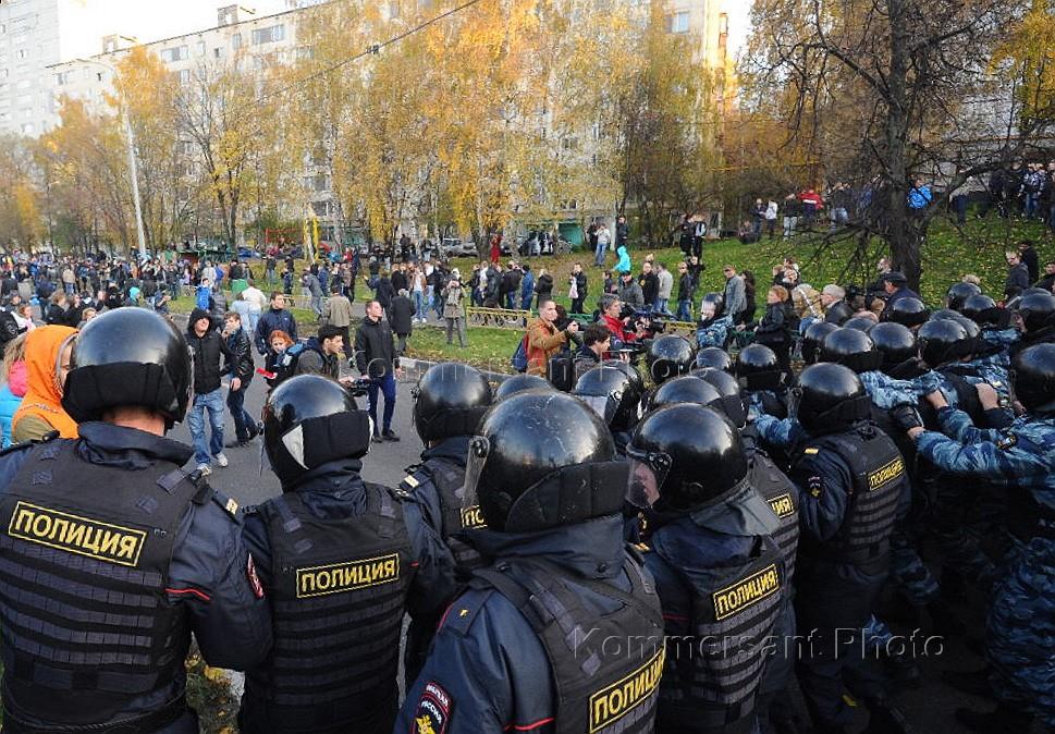 Беспорядки во время народного схода жителей Бирюлево. Участники схода требовали задержать преступника, который 10 октября зарезал молодого человека, закрыть расположенную в районе овощную базу и ужесточить миграционное законодательство.