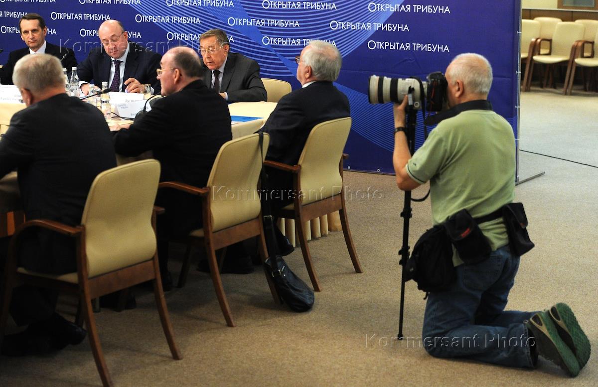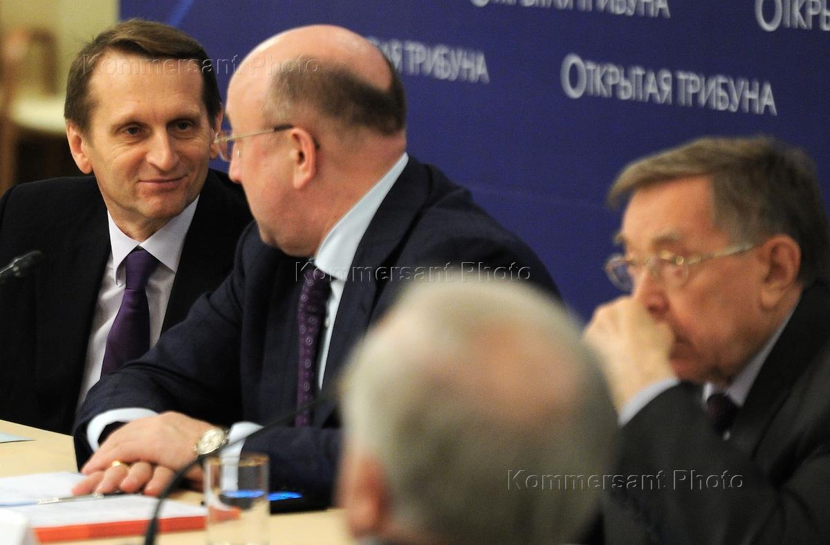 "Открытая трибуна" на тему "Реформирование судебной системы". Слева направо: председатель Государственной дума России Сергей Нарышкин, председатель Комитета Государственной думы России по конституционному законодательству и государственному строительству Владимир Плигин, советник Президента России Вениамин Яковлев на заседании в Госдуме России.