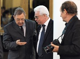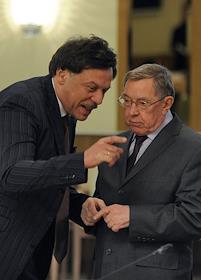 "Открытая трибуна" на тему "Реформирование судебной системы". Полномочный представитель Правительства России в высших судебных инстанциях Михаил Барщевский (слева) и советник Президента России Вениамин Яковлев (справа) на заседании в Госдуме России.