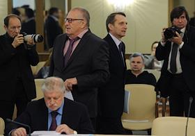"Открытая трибуна" на тему "Реформирование судебной системы". Лидер партии "Справедливая Россия", член комитета Государственной думы (ГД) России по жилищной политике и жилищно-коммунальному хозяйству Сергей Миронов (второй слева), лидер Либерально-демократической партии России (ЛДПР), член комитета ГД по обороне Владимир Жириновский (третий слева), председатель Государственной думы России Сергей Нарышкин (в центре) на заседании в Госдуме России.