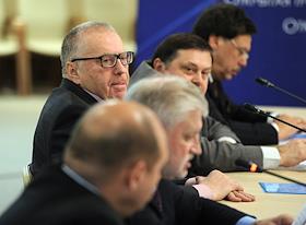 "Открытая трибуна" на тему "Реформирование судебной системы". Слева направо: председатель комиссии по совершенствованию правосудия Общероссийской организации "Ассоциация юристов России" Владислав Туманов, лидер партии "Справедливая Россия", член комитета Государственной думы (ГД) России по жилищной политике и жилищно-коммунальному хозяйству Сергей Миронов, лидер Либерально-демократической партии России (ЛДПР), член комитета ГД по обороне Владимир Жириновский, заместитель председателя комитета ГД по конституционному законодательству и государственному строительству Вадим Соловьев, полномочный представитель Правительства России в высших судебных инстанциях Михаил Барщевский на заседании в Госдуме России.