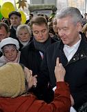 Мэр Москвы Сергей Собянин (центр) во время посещения строящегося транспортно-пересадочного узла в Выхино и рынка "Экоферма".