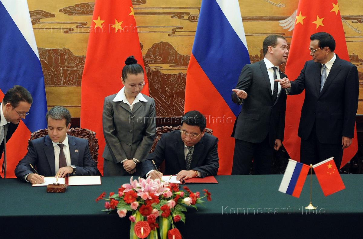 Рабочая поездка председателя правительства России Дмитрия Медведева в Китай. Председатель правительства России Дмитрий Медведев (второй справа), премьер Государственного совета КНР Ли Кэцян (справа) и министр связи и массовых коммуникаций России Николай Никифоров (второй слева) на церемонии подписания совместных документов.