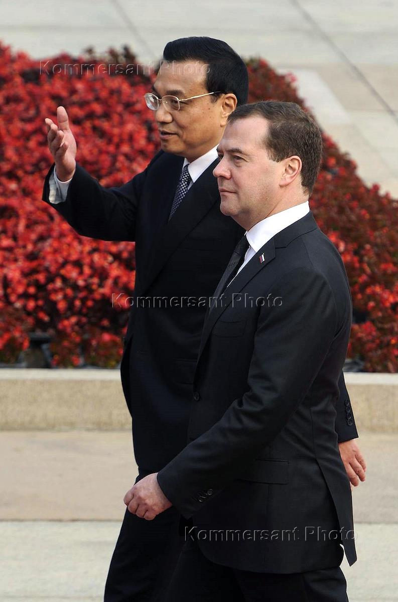 Рабочая поездка председателя правительства России Дмитрия Медведева в Китай. Председатель правительства России Дмитрий Медведев (справа) во время официальной встречи c премьером Государственного совета КНР Ли Кэцян.