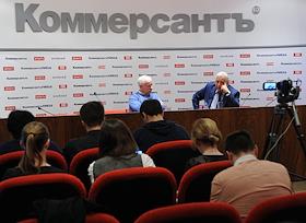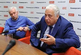 Директор по стратегическим направлениям издательского дома "Коммерсантъ" Виктор Лошак (слева) и заместитель мэра Москвы в правительстве Москвы по вопросам социального развития Леонид Печатников (справа) во время проведения лекции для студентов "Академии журналистики Ъ" в конференц-зале ИД "Коммерсантъ".