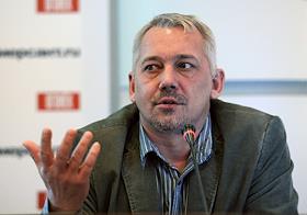 Директор по стратегическим направлениям издательского дома "Коммерсантъ" Виктор Лошак во время проведения лекции для студентов "Академии журналистики Ъ" в конференц-зале ИД "Коммерсантъ".