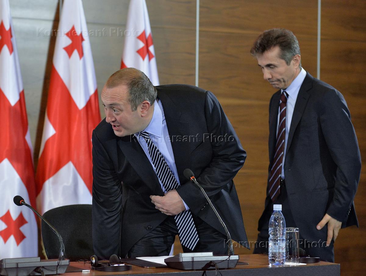 Presidential candidate from the Georgian Coalition "Georgian Dream" George Margvelashvily (right) and Prime Minister of Georgia Bidzina Ivanishvili (left) at a press conference after the presidential election.