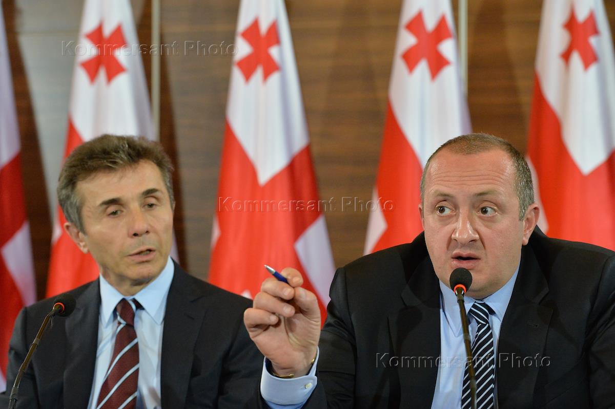 Presidential candidate from the Georgian Coalition "Georgian Dream" George Margvelashvily (right) and Prime Minister of Georgia Bidzina Ivanishvili (left) at a press conference after the presidential election.