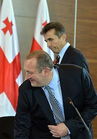 Премьер-министр Грузии Бидзина Иванишвили (слева) и кандидат в президенты Грузии от коалиции "Грузинская мечта" Георгий Маргвелашвили (справа) на пресс-конференции по итогам президентских выборов.