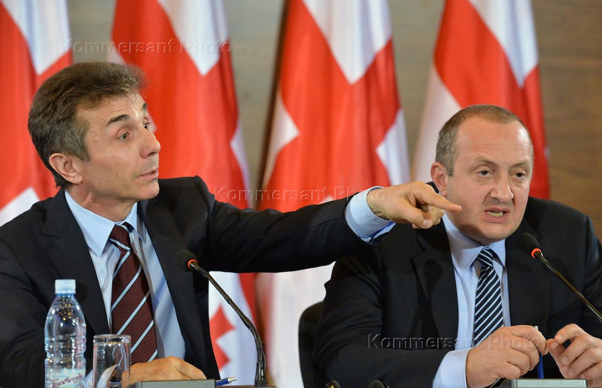 Presidential candidate from the Georgian Coalition "Georgian Dream" George Margvelashvily (right) and Prime Minister of Georgia Bidzina Ivanishvili (left) at a press conference after the presidential election.