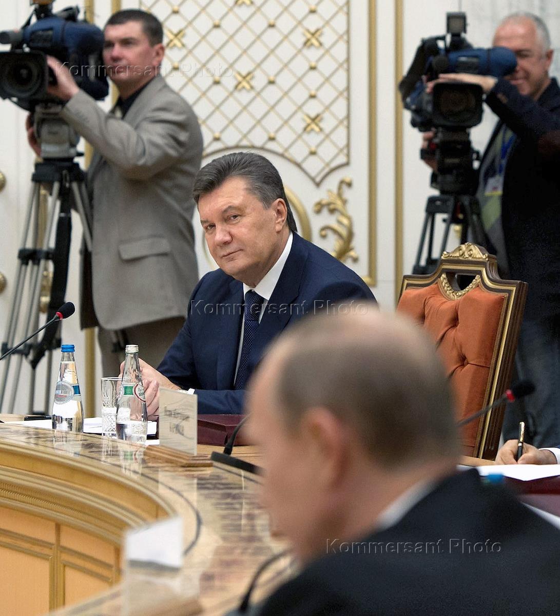 Рабочий визит президента Украины Виктора Януковича в Республику Беларусь. Президент России Владимир Путин (слева) и президент Украины Виктор Янукович (справа) на заседании Совета глав государств Содружества Независимых Государств (СНГ).