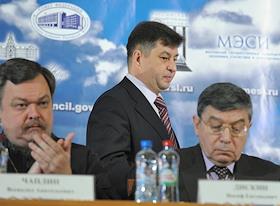Представитель в Совете Федерации от исполнительной власти Челябинской области Руслан Гаттаров (в центре) и руководитель Российского Агентства развития информационного общества "РАРИО", председатель президиума Общероссийского совета некоммерческих организаций Александр Айгистов (справа) на четвертом съезде некоммерческих организаций России. Съезд прошел в Большом актовом зале Всероссийской библиотеки им.Ленина.