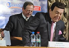 Председатель Исполнительного комитета Ассоциации "Центрально– Черноземная" Григорий Федоров (слева) и член Комитета Государственной думы России по культуре Иосиф Кобзон (справа) на четвертом съезде некоммерческих организаций России. Съезд прошел в Большом актовом зале Всероссийской библиотеки им.Ленина.