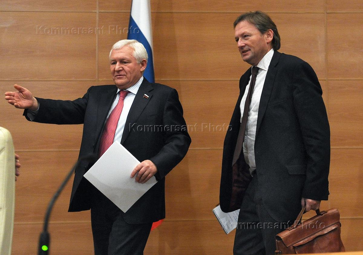 Член комитета Государственной думы России по конституционному законодательству и государственному строительству Владимир Поневежский (слева) перед началом выступления с лекцией уполномоченного при президенте России по защите прав предпринимателей Бориса Титова (справа), посвященной 20-летию Конституции Российской Федерации. Выступление состоялась в малом зале Государственной думы России.