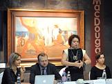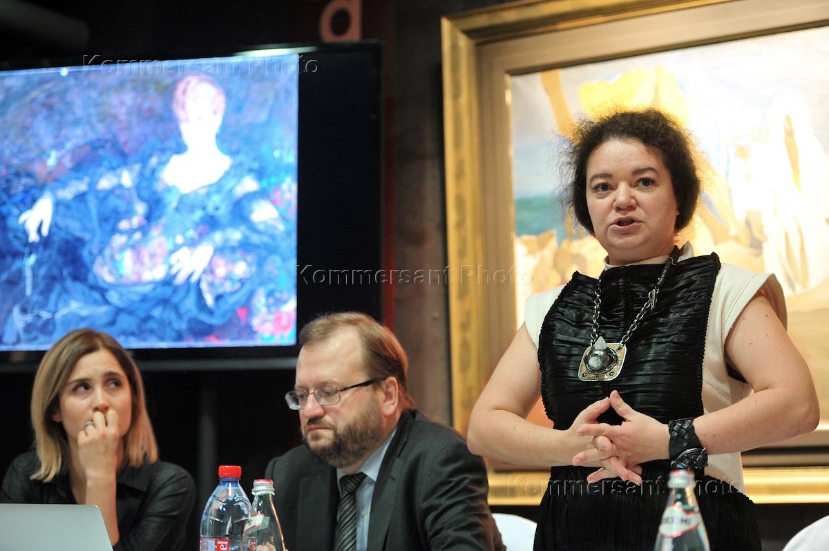Корреспондент издательского дома "Коммерсантъ" Татьяна Маркина (в центре) на пресс-конференции, посвященной выставке "Мир глазами русских художников" аукционного дома MacDougall's.