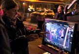 Киноиндустрия. Съемка рекламного ролика кинокомпании "Park Production". Просмотр готового материала на мониторе.