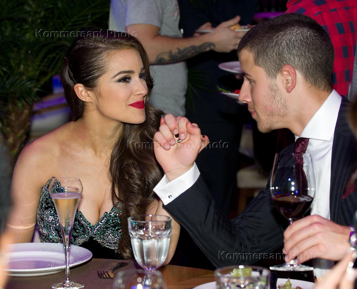 Победительница конкурса "Мисс Вселенная 2012" из США Оливия Калпо (слева) и музыкант Ник Джонас (США) (справа) во время полуфинала конкурса "Мисс Вселенная – 2013" (Miss Universe). Полуфинал конкурса прошел в Crocus City Hall.