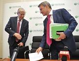 Председатель Центрального Банка России Сергей Игнатьев (слева) и президент "Сбербанка России" Герман Греф (справа) на презентации стратегии развития Сбербанка России на период до 2018 года. Презентация прошла в здании Сбербанка России.